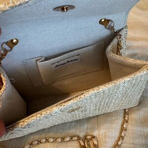 This elegant cream woven bag features a unique beaded handle, perfect for adding a touch of sophistication to any outfit. The stylish design and neutral color make it a versatile accessory for any occasion.