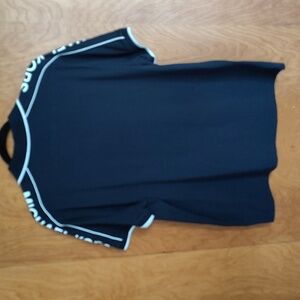 Very cool Michael Kors polo shirt. Navy blue with white piping around the sleeve openings and white Michael Kors logo along the shoulders.