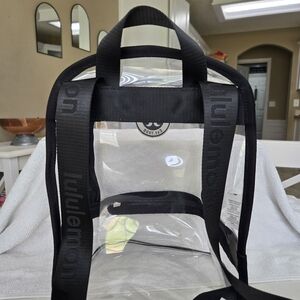 Stylish Lululemon clear backpack, Perfect for on-the-go convenience. Bag is like new, only used once, bundle also comes with a zip wrist pouch, again, like new, used once. Bag is approx. 8.5×12in.