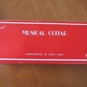 New in box musical guitar for tabletop/collectible.. Wind key. Handcrafted in Hong Kong. Style No. 1002. Measures 12" length and 4" width.