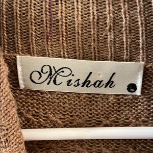 This tan sweater showcases a stylish turtleneck design and a textured ribbed knit, providing both comfort and elegance. Its long sleeves and relaxed fit make it an ideal choice for layering during chilly days.