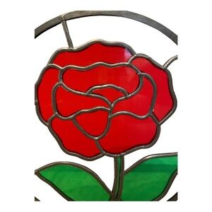 This is a beautiful stained glass sun catcher. See close up images of the metalwork. It comes in its own customized box with a hand-cut triangular wooden base.