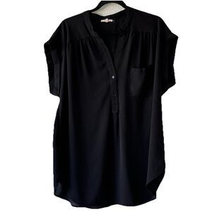Pleione Henley Blouse Short Hemmed Sleeves V Neck Black Women’s XL Pleats Pocket