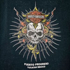 Harley-Davidson t-shirt featuring a striking skull design with flames and tribal elements from Puerto Progreso Yucatan Mexico dealership. Classic black cotton tee with iconic bar and shield logo on front, large back graphic.
