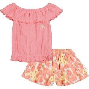 Colorful flowers bring energy and ruffles add charm to this playful skort set by Calvin Klein Jeans, featuring elasticized edging for a secure fit suitable for playtime.