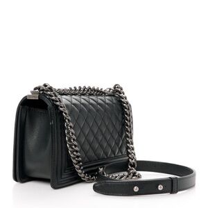 Caviar Quilted Medium Boy Flap in Black. This shoulder bag is crafted of caviar leather in black. The bag features a ruthenium chain shoulder strap with a leather shoulder pad, a diamond quilted crossover flap with a linear quilted border, and a ruthenium boy push lock. This opens to a black fabric interior with a patch pocket.