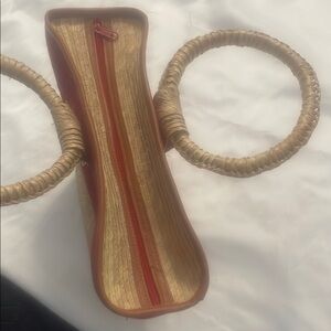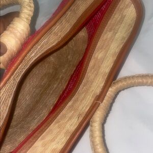 This eye-catching tote bag combines a vibrant red upper with a natural tan lower section, crafted from tightly woven rattan straw materials for a sturdy feel. Its unique basket-like shape and high-arching handle make it perfect for casual outings or beach days. The spacious design ensures you can carry all your essentials in style. Excellent preowned condition.