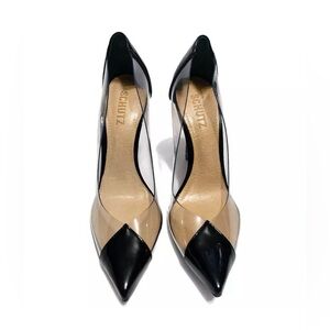 Step out in style with these elegant black and clear heels from Schutz. Perfect for any occasion, these shoes offer a chic and modern look.