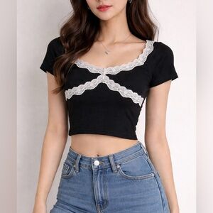 Scoop Neck Little Black Lace Trim Crop Too Tee Women’s T-Shirt Sz XS Vintage EUC