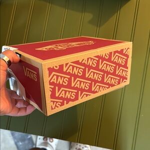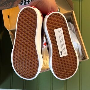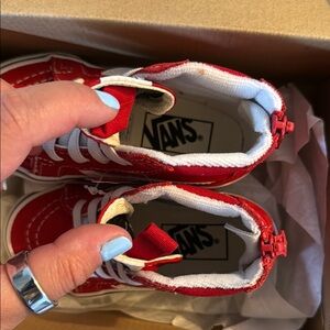 Stylish red high-top sneakers by Vans. Features white laces and accents. Box included new size 6.5 toddler