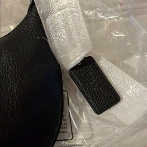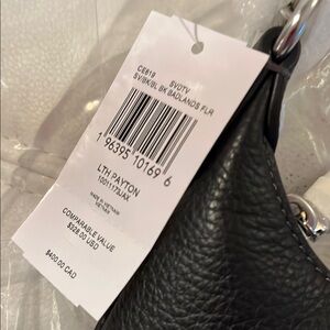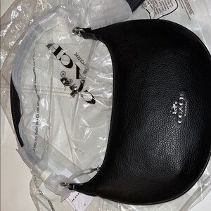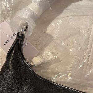 Elegant black leather shoulder bag. Features silver hardware. Classic Coach design.