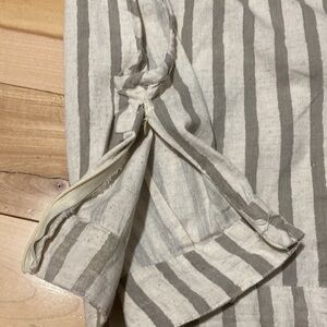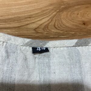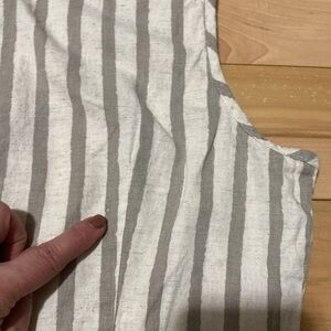 This stylish sleeveless top features a chic striped pattern with a beautiful embroidered design. Perfect for casual outings, it combines comfort with a touch of elegance. In great preloved condition. One loose thread in the embroidery and a tiny mark on the back see pictures. One tag that says 44, there is a light fluffy material on interior I believe from the patterning and sewing process and writing on the interior collar see pictures. Material feels natural and breathable almost like a cotton or hemp like material but there is no tag to really know.