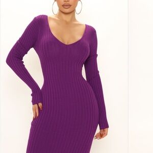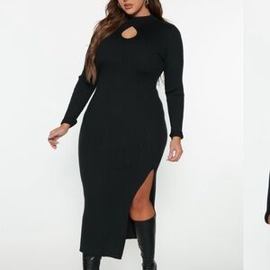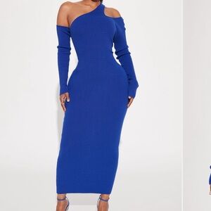 Lovely blue and black patterned sweater dress perfect for any occasion. Stand out with its unique design and comfortable fit. Features right side slit.