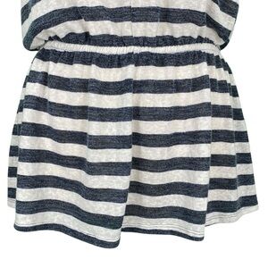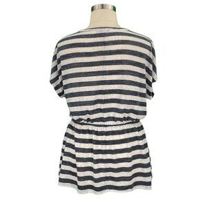 Features: White and Heathered Blue Stripes Light Weight Semi Sheer Would Need a Cami Underneath Stretchy Casual Preppy Boho Bohemian Cute Costal Beachy Flowy Neutral Easy Dress Up or Down Daytime Split Neck Short Sleeve Elastic Waist Peplum Knit Tunic