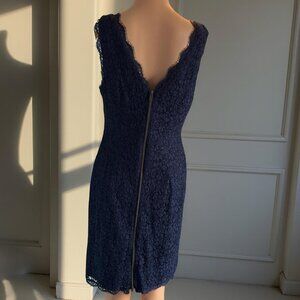 This navy blue lace dress has a nylon/viscose shell and nylon lining. There is an attractive wide zipper that runs the length of the back. There is eyelash trim around the edges. Pre-owned in excellent condition. Great for a spring or summer formal event or party.