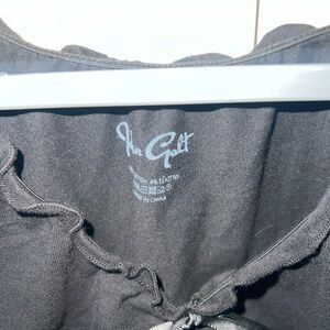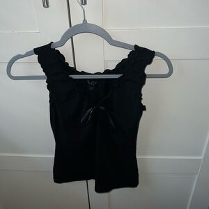 The Black Blair Tank Top from John Galt brings a feminine flair to your everyday look. This charming piece has a satin bow front detail and lettuce-edge trimming, making it a versatile addition to your wardrobe for both casual and dressed-up occasions.