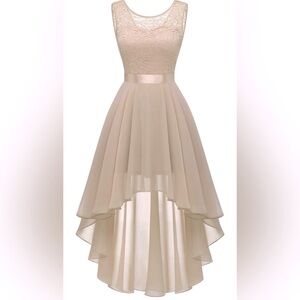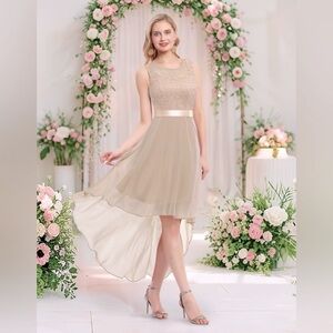 - This exquisite dress showcases a tan & gold palette with an asymmetrical high-low hemline, ideal for prom.