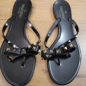 Valentino Garavani PVC sandal. Bow detail with platinum-finish studs. Slip-on style. In great pre-owned conditions, signs of wear on the sole Lots of life left in these beautiful sandals. Size: 41 (US 11) **Based on measurements, they are more like a 10.5. Please see pictures