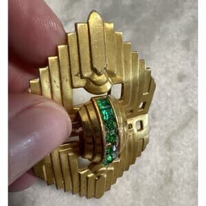 Vintage Early Coro Signed Art Deco Emerald Green Rhinestone Gold Tone Brooch