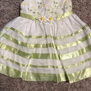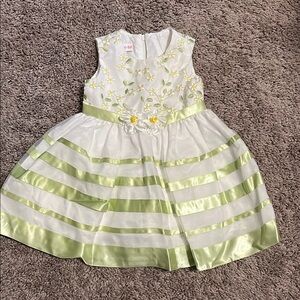 This charming kids dress features delicate floral embroidery on a white base with green accents. Perfect for special occasions, it combines elegance with comfort.