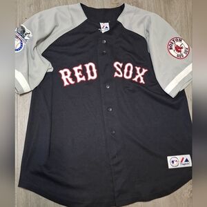 ORTIZ Boston Red Sox jersey men's size 2XL. Genuine Magestic MBL Merchandise. Armpit to armpit is 28 inches. This is a button up shirt.....bottom button has been replaced. Color is black & grey. There are a couple very small catches....I had to look clos to see them. Shoulder to bottom is 33.