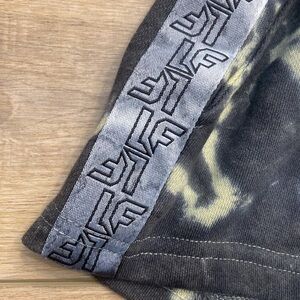 Black and pale chartreuse green tie dye logo gym shorts by LF. Features a printed LF on the front left and logo tape down the sides. Wide stretchy waist band and super soft knit fabric. Lace up detail on the front, but they are pull on and off. I’m excellent condition, no flaws, Size Medium M