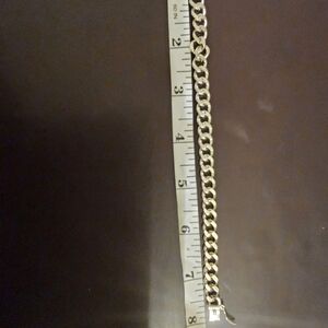 This bold silver bracelet features a chunky chain link design with thick, interlocking links that create a modern and substantial look. The polished finish adds a sleek and shiny appearance, making it a standout accessory for any occasion.
