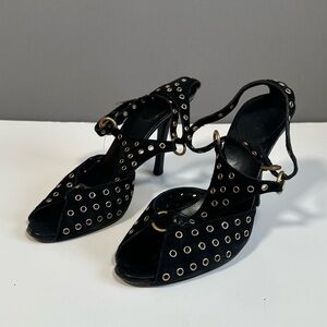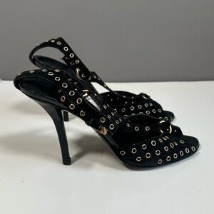 These Gucci black high-heeled sandals feature a sleek slip-on design with two thin straps adorned with metallic studs, offering a chic and edgy look. The suede leather and the 4 inch thin heels add a touch of sophistication to any outfit. Perfect for making a bold statement, these heels are a must-have for any fashion-forward wardrobe.