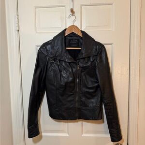 Stylish black coat with a hood and button closure. Features front pockets, made of a wool blend and in excellent condition.