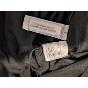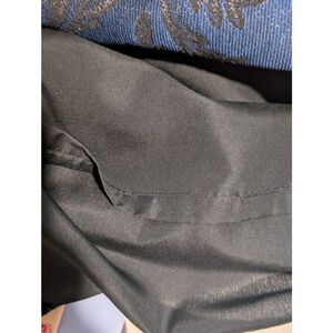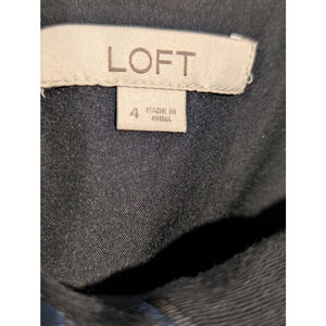 This is a pre-owned LOFT skirt, size 4. The skirt features a black background with a blue and silver floral pattern. It has a wrap-around style with a button closure. The outer material is 56% polyester, 30% cotton, and 14% other fiber, while the lining is 100% polyester. The skirt is in good condition with no visible imperfections.