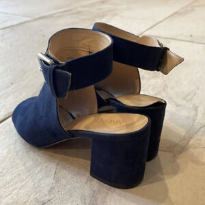 Lively block heels with ankle strap and peep toe. 3” at back of heel. Insert is slightly lifting on right shoe which is why they’re reduced! Easy fix. Lots of wear left.