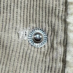⁉️ Detailed Flaws: A little hole next to one of the snaps and a tiny brown stain on the back sleeve and another small hole on the back