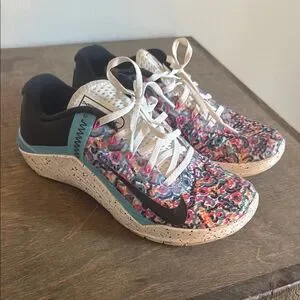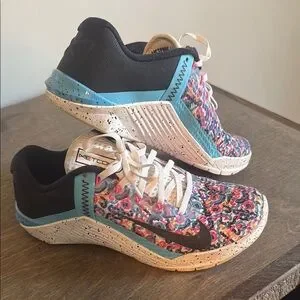 Vibrant Nike Metcon sneakers with a colorful pattern and black accents. Perfect for workouts.