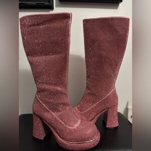 These cowboy boots have a vegan leather construction, strawberries printed all over, pull loops, pointed toes, and stacked block heels.