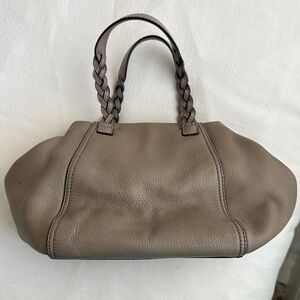 Elegant taupe leather handbag with braided handles. Perfect for any occasion.