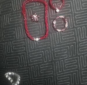 This stunning red beaded jewelry set is perfect for adding a touch of elegance to any outfit. The set includes a necklace, bracelet, and ring, all featuring vibrant red beads. Ideal for special occasions or everyday wear.