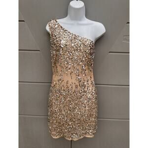Mac Duggal 10977 Nude/beige One Shoulder Asymmetric Sheer Hand Beaded Mini Dress Sz 12
