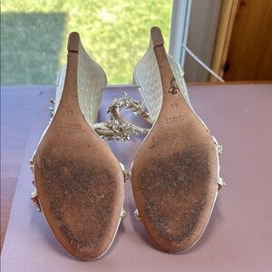 Used pair shown in photos. I also added photos from the original purchase listing. Worn one time for my wedding 5 years ago (still going strong!). Perfect for outdoor wedding - wedge heel won’t sink in but still gives you height.