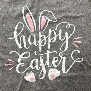 Celebrate Easter with this charming gray t-shirt featuring a playful 'Happy Easter' design.