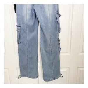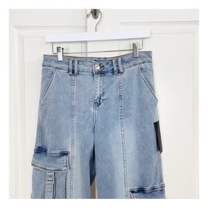 new with tags Alejandra Slouchy Wide Leg Cargo Jeans in Vintage Celeste Wash from Retrofete. zip fly, slant front pockets, back flap pockets and cargo pockets. 86% cotton 13% poly 1% spandex.
