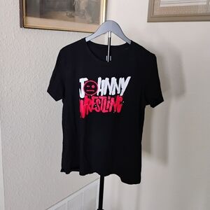 Stylish white button-up shirt featuring a subtle black heart pattern. Roll tab sleeves and collared neckline. Perfect for a casual or semi-formal look. Hi-Low shirt.