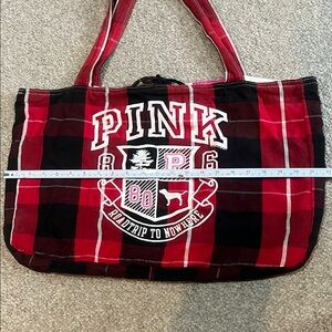 Stylish and spacious PINK Victoria's Secret plaid tote bag, perfect for everyday use. Features a bold red and black design.