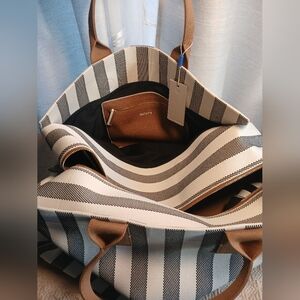 Structured design in ivory and black stripes, with a double-zipper top closure and durable bag feet.