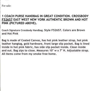Lined With Fabric, 2 Interior Pockets I Zip Pocket, Silver Hardware, Coach Leather Hang Tag,Coach Signature On Front, Zipper Closure. Removable Strap