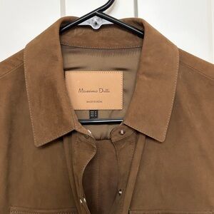 Soft brown suede jacket shirt. Silver snap buttons, chest pockets and shirt cuffs. Soft enough to roll back sleeves. Size medium. Perfect condition.