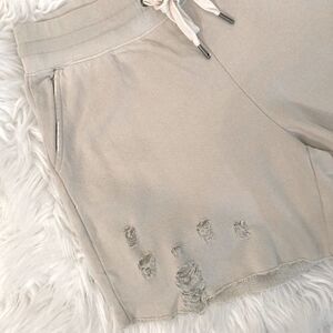 These super comfy shorts with an oversized fit, raw edge hem and deconstructed styling are exactly what you need for your next outdoor concert, roadtrip, theme park or vacation! Made of a cotton/rayon blend, these shorts feature an elastic waistband with functional drawstring and a back patch pocket to complete the look! NWT, never worn, excellent condition!