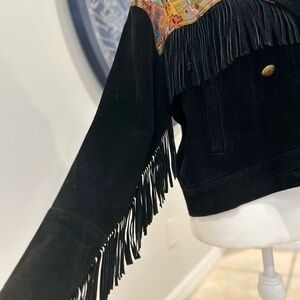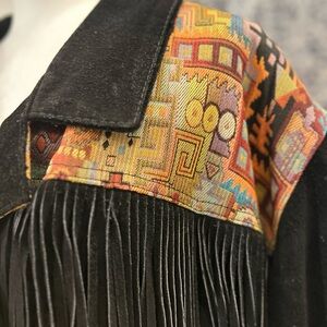 Beautifully preserved vintage western Linea Pelle jacket, featuring fringe details and vibrant multicolor Aztec print. Itβs sturdy and heavy and extremely well made. One of my favorite finds ever!