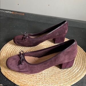 In excellent preowned condition size 8, style to comfort .Step out in style with these elegant purple women's shoes. Perfect for any occasion, these shoes offer both comfort and sophistication.Ballet block heel shoes