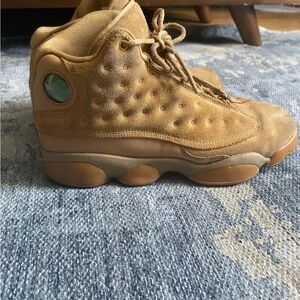 Stylish tan high-top sneakers with a sleek design. Perfect for casual wear. All tan air Jordan’s. Size 5.5 condition shown in photos. Gently used with small tear. No box.