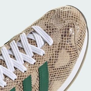 These Adidas sneakers feature a striking combination of tan and green, highlighted by the iconic three green stripes. The textured upper adds a unique flair, while the white sole and laces provide a clean contrast. Perfect for making a statement with every step.